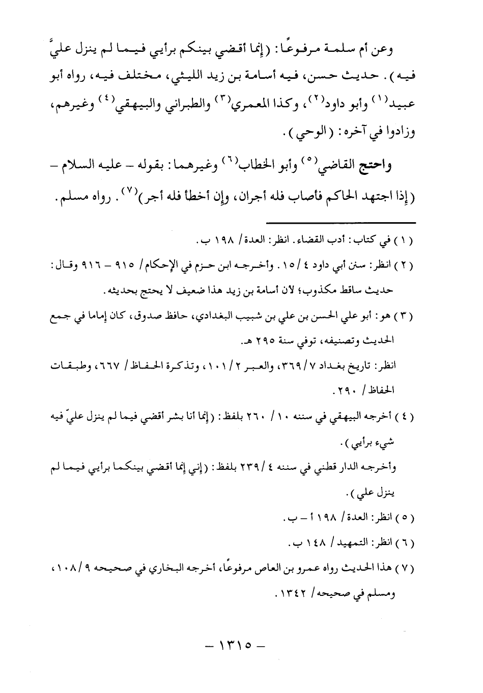 وعن أم سلمة مرفوعاً: (إِنما أقضي بينكم برأيي فيما لم ينزل عليَّ فيه). حديث حسن، فيه أسامة بن زيد الليثي، مختلف فيه، رواه أبو عبيد (١) وأبو داود (٢)، وكذا المعمري (٣) والطبراني والبيهقي (٤) وغيرهم، وزادوا في آخره: (الوحي).