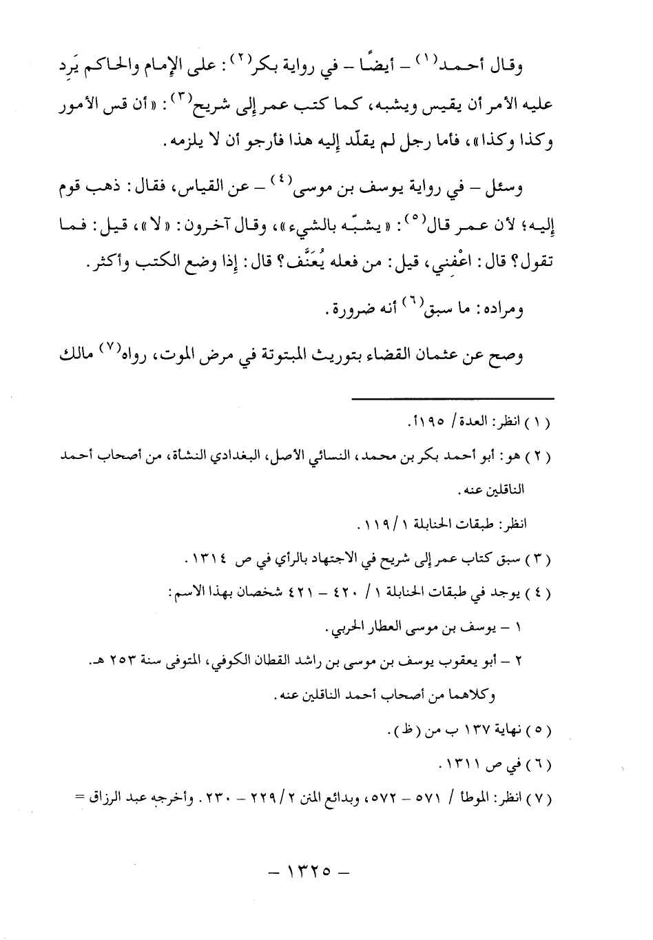 وقال أحمد (١) -أيضًا- في رواية بكر (٢): على الإِمام والحاكم يَرِد عليه الأمران يقيس ويشبه، كما كتب عمر إِلى شريح (٣): "أن قس الأمور وكذا وكذا"، فأما رجل لم يقلّد إِليه هذا فأرجو أن لا يلزمه.