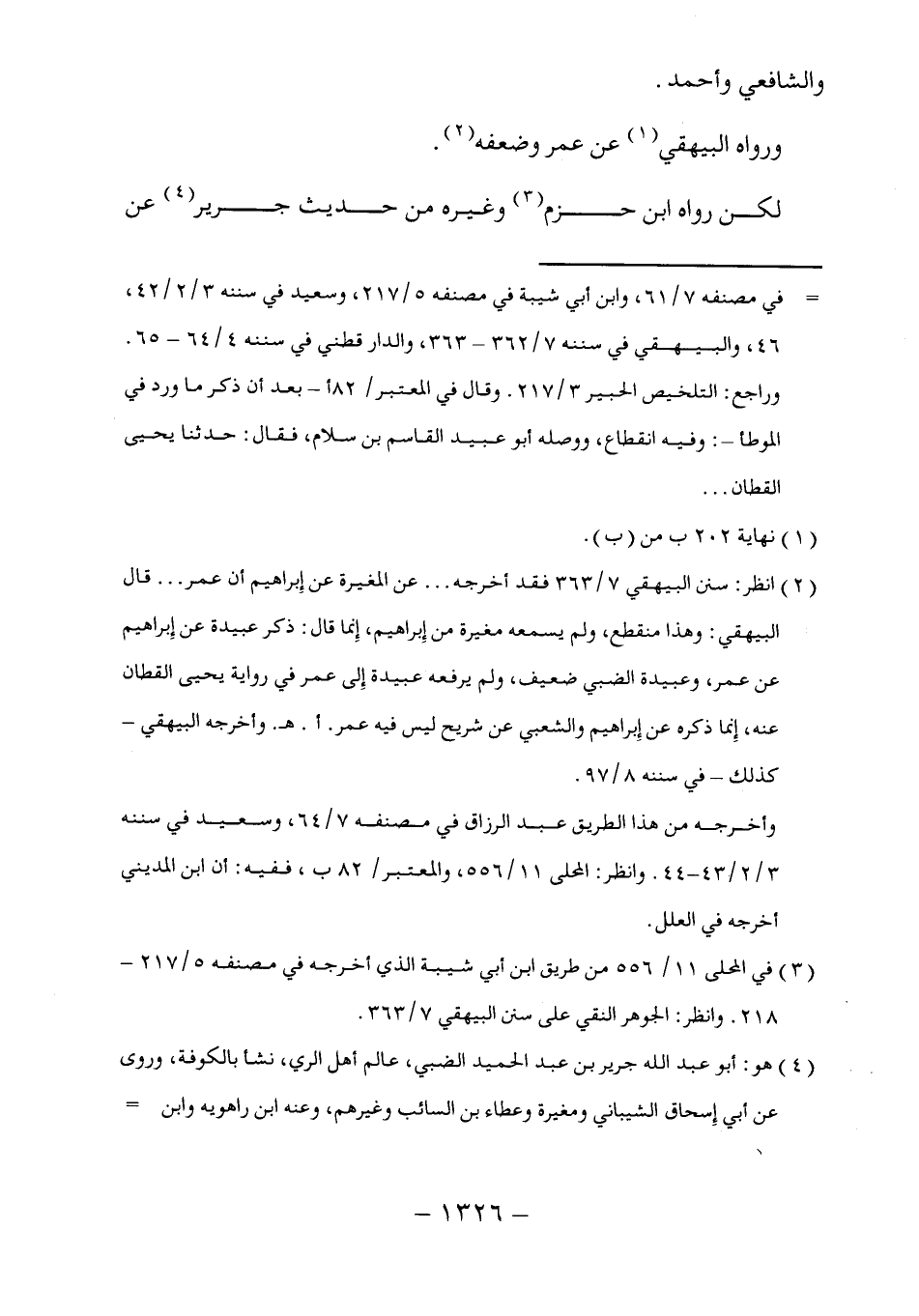 (٢) انظر: سنن البيهقي ٧/ ٣٦٣ فقد أخرجه ... عن المغيرة عن إِبراهيم أن عمر ... قال البيهقي: وهذا منقطع، ولم يسمعه مغيرة من إِبراهيم، إِنما قال: ذكر عبيدة عن إِبراهيم عن عمر، وعبيدة الضبي ضعيف، ولم يرفعه عبيدة إِلى عمر في رواية يحيى القطان عنه، إِنما ذكره عن إِبراهيم والشعبي عن شريح ليس فيه عمر. أ. هـ. وأخرجه البيهقي -كذلك- في سننه ٨/ ٩٧.