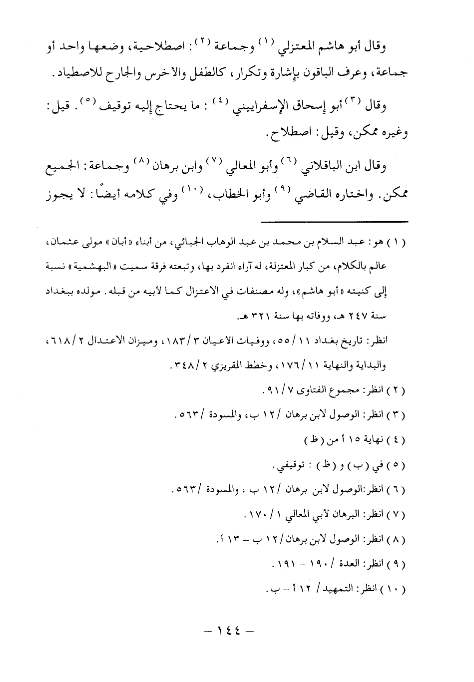(١) هو: عبد السلام بن محمد بن عبد الوهاب الجبائي، من أبناء "أبان" مولى عثمان، عالم بالكلام، من كبار المعتزلة، له آراء انفرد بها، وتبعته فرقة سميت "البهشمية" نسبة إِلى كنيته "أبو هاشم"، وله مصنفات في الاعتزال كما لأبيه من قبله. مولده ببغداد سنة ٢٤٧ هـ، ووفاته بها سنة ٣٢١ هـ.