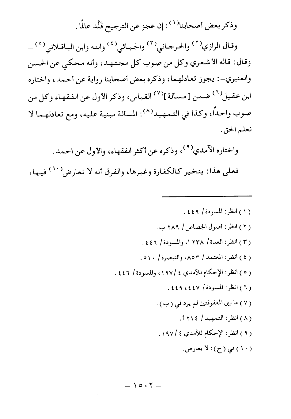 واختاره الآمدي (٩)، وذكره عن أكثر الفقهاء، والأول عن أحمد.