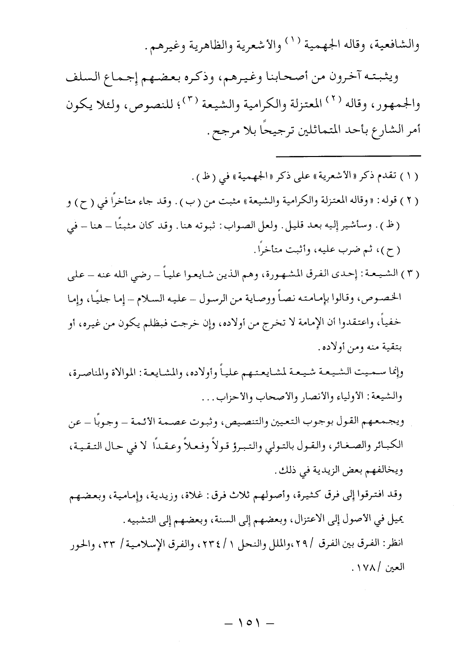 (٢) قوله: "وقاله المعتزلة والكرامية والشيعة" مثبت من (ب). وقد جاء متأخرًا في (ح) و (ظ). وسأشير إِليه بعد قليل. ولعل الصواب: ثبوته هنا. وقد كان مثبتًا -هنا- في (ح)، ثم ضرب عليه، وأثبت متأخرًا.