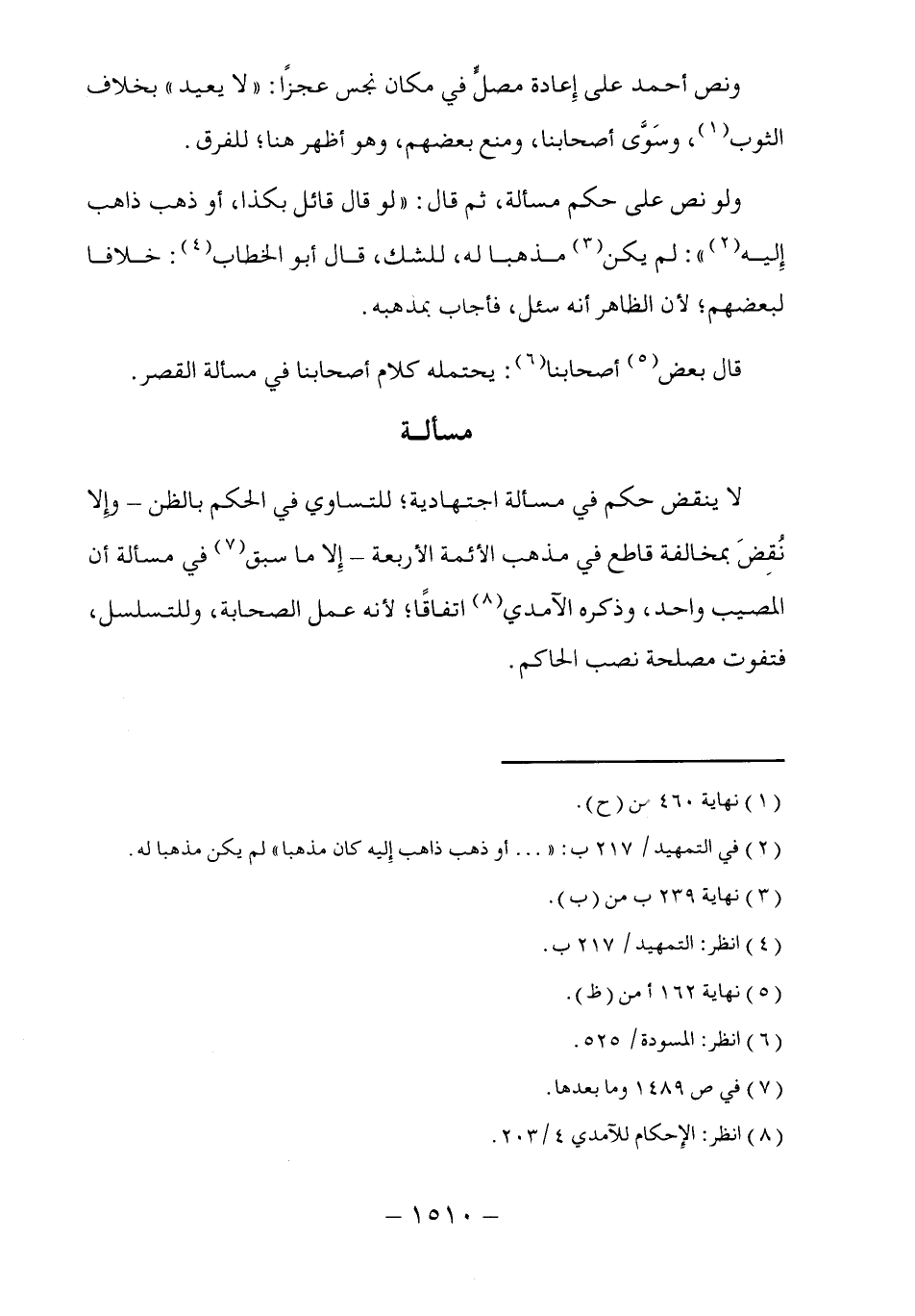 لا ينقض حكم في مسألة اجتهادية؛ للتساوي في الحكم بالظن -وإلا نُقِضَ بمخالفة قاطع في مذهب الأئمة الأربعة- إِلا ما سبق (٧) في مسألة أن المصيب واحد، وذكره الآمدي (٨) اتفاقًا؛ لأنه عمل الصحابة، وللتسلسل، فتفوت مصلحة نصب الحاكم.