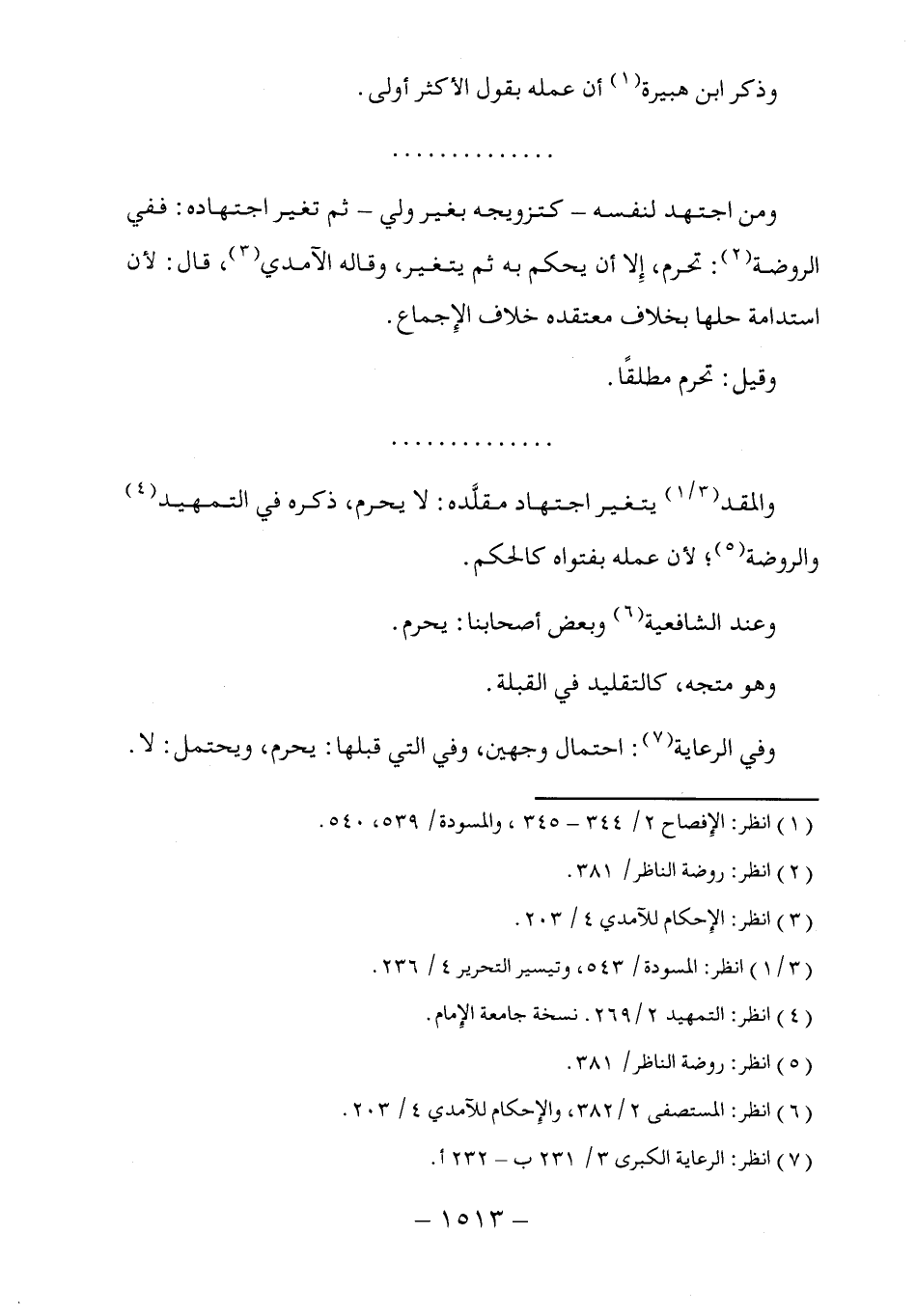 ومن اجتهد لنفسه -كتزويجه بغير ولي- ثم تغير اجتهاده: ففي الروضة (٢): تحرم، إِلا أن يحكم به ثم يتغير، وقاله الآمدي (٣)، قال: لأن استدامة حلها بخلاف معتقده خلاف الإِجماع.