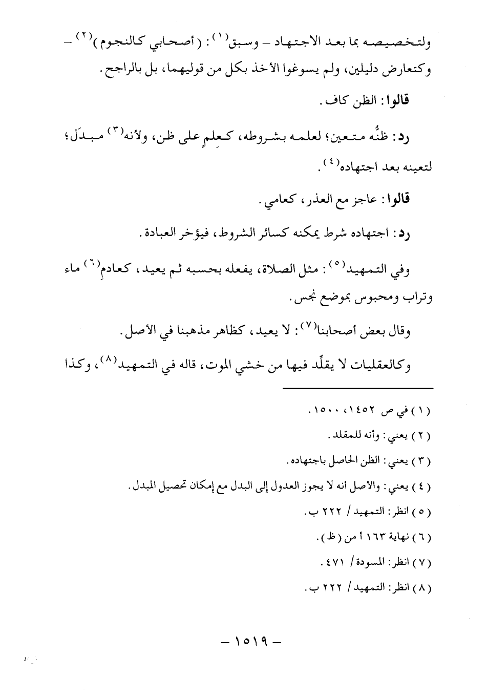 رد: ظنُّه متعين؛ لعلمه بشروطه، كعِلمٍ على ظن، ولأنه (٣) مبدَل؛ لتعينه بعد اجتهاده (٤).