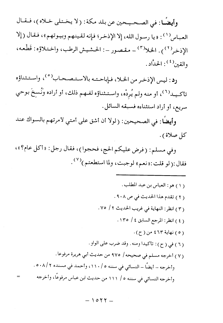 رد: ليس الإِذخر من الخلا، فإِباحته بالاستصحاب (٥)، واستثناؤه تأكيد (٦)، أو منه ولم يُرِدْه، واستثناؤه لفهم ذلك، أو أراده وَنُسِخَ بوحي سريع، أو أراد استثناءه فسبقه السائل.