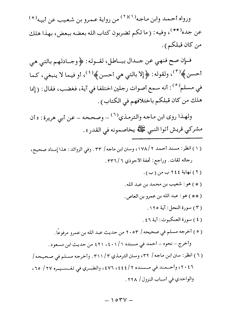 فإِن صح فنهي عن جدال بباطل؛ لقوله: (وجادلهم بالتي هي أحسن) (٣)، ولقوله: (إِلا بالتي هي أحسن) (٤)، أو فيما لا ينبغي، كما في مسلم (٥): أنه سمع أصوات رجلين اختلفا في آية، فغضب، فقال: (إِنما هلك من كان قبلكم باختلافهم في الكتاب).