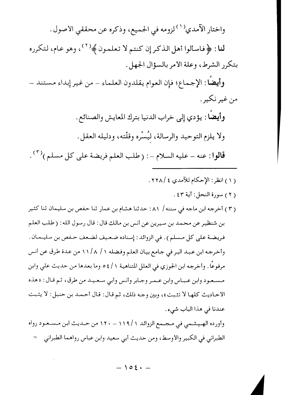 (٣) أخرجه ابن ماجه في سننه/ ٨١: حدثنا هشام بن عمار ثنا حفص بن سليمان ثنا كثير بن شنظير عن محمَّد بن سيرين عن أنس بن مالك قال: قال رسول الله: (طلب العلم فريضة على كل مسلم). في الزوائد: إِسناده ضعيف لضعف حفص بن سليمان. وأخرجه ابن عبد البر في جامع بيان العلم وفضله ١/ ٨/ ١١ من عدة طرق عن أنس مرفوعًا. وأخرجه ابن الجوزي في العلل المتناهية ١/ ٥٤ وما بعدها من حديث علي وابن مسعود وابن عباس وابن عمر وجابر وأنس وأبي سعيد من طرق، ثم قال: "هذه الأحاديث كلها لا تثبت"، وبين وجه ذلك، ثم قال: قال أحمد بن حنبل: لا يثبت عندنا في هذا الباب شيء.