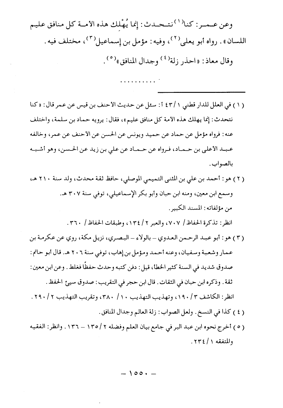 (١) في العلل للدارقطني ١/ ٤٣ أ: سئل عن حديث الأحنف بن قيصى عن عمر قال: "كنا نتحدث: إِنما يهلك هذه الأمة كل منافق عليم"، فقال: يرويه حماد بن سلمة، واختلف عنه: فرواه مؤمل عن حماد عن حميد ويونس عن الحسن عن الأحنف عن عمر، وخالفه عبد الأعلي بن حماد، فرواه عن حماد عن علي بن زيد عن الحسن، وهو أشبه بالصواب.