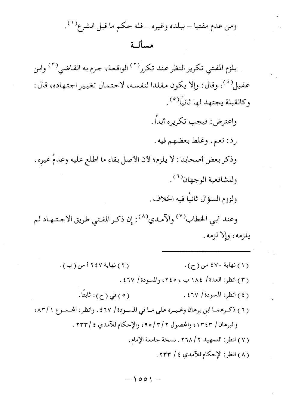 يلزم المفتي تكرير النظر عند تكرر (٢) الواقعة، جزم به القاضي (٣) وابن عقيل (٤)، وقال: وإِلا يكون مقلدا لنفسه؛ لاحتمال تغيير اجتهاده، قال: وكالقبلة يجتهد لها ثانيًا (٥).
