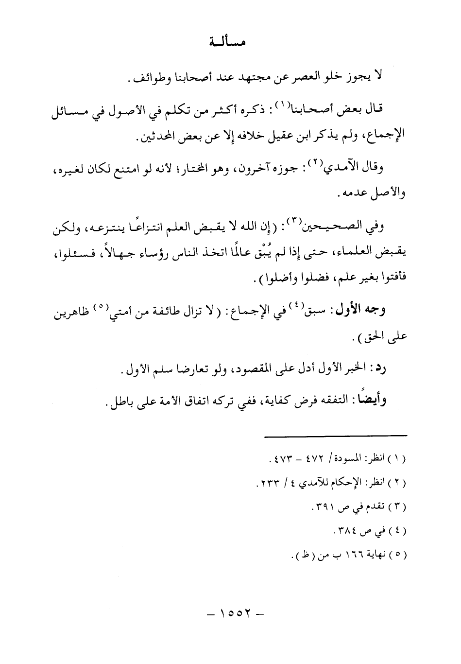 لا يجوز خلو العصر عن مجتهد عند أصحابنا وطوائف.