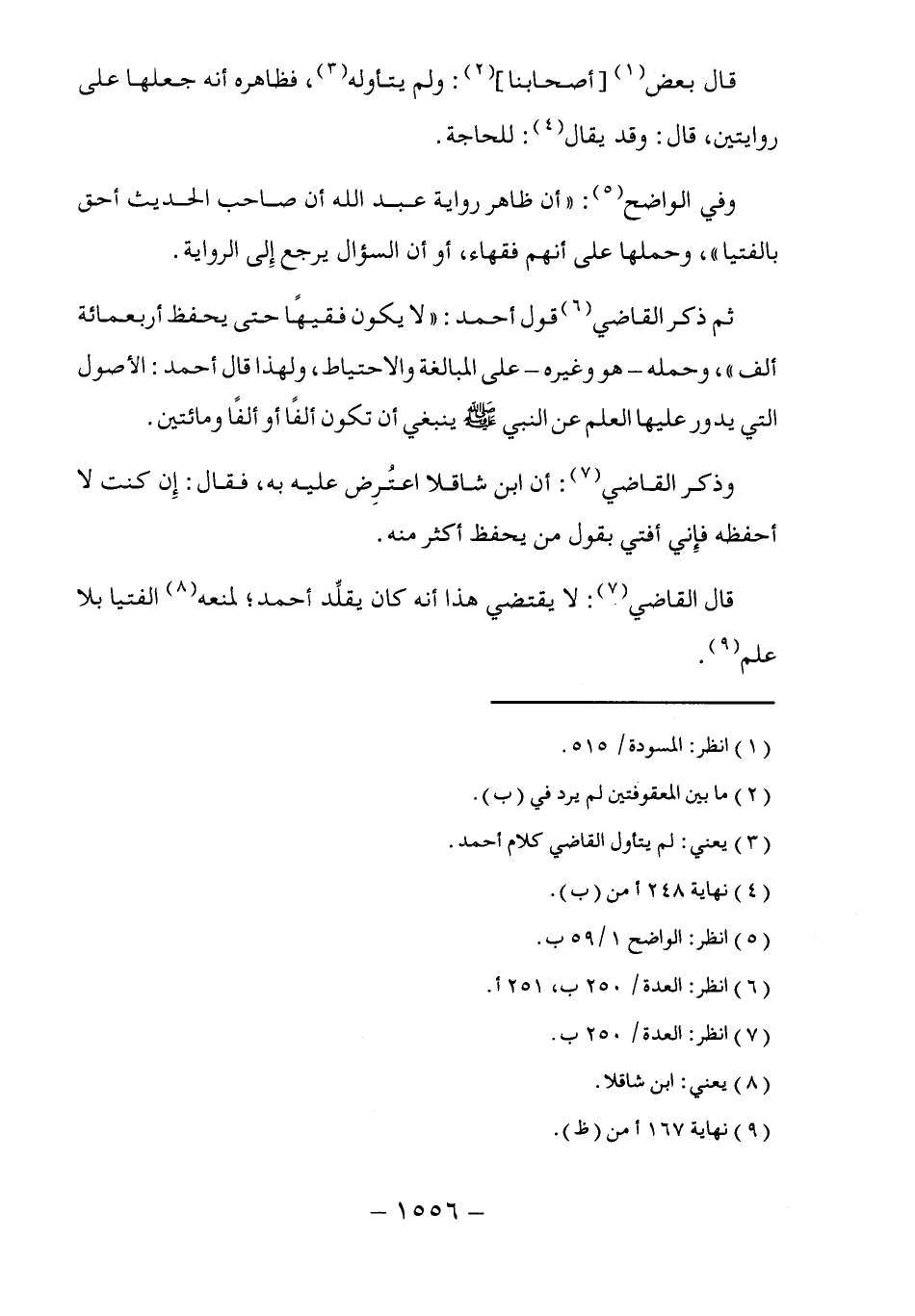 ثم ذكر القاضي (٦) قول أحمد: "لا يكون فقيهًا حتى يحفظ أربعمائة ألف"، وحمله -هو وغيره- على المبالغة والاحتياط، ولهذا قال أحمد: الأصول التي يدور عليها العلم عن النبي - صلى الله عليه وسلم - ينبغي أن تكون ألفًا أو ألفًا ومائتين.