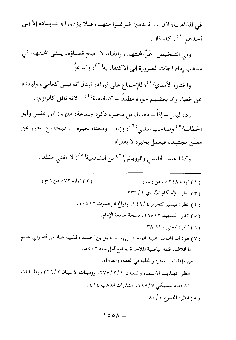 رد: ليس -إِذاً- مفتيا، بل مخبر، ذكره جماعة، منهم: ابن عقيل وأبو الخطاب (٥) وصاحب المغني (٦)، وزاد -ومعناه لغيره-: فيحتاج يخبر عن معيَّن مجتهد، فيعمل بخبره لا بفتياه.