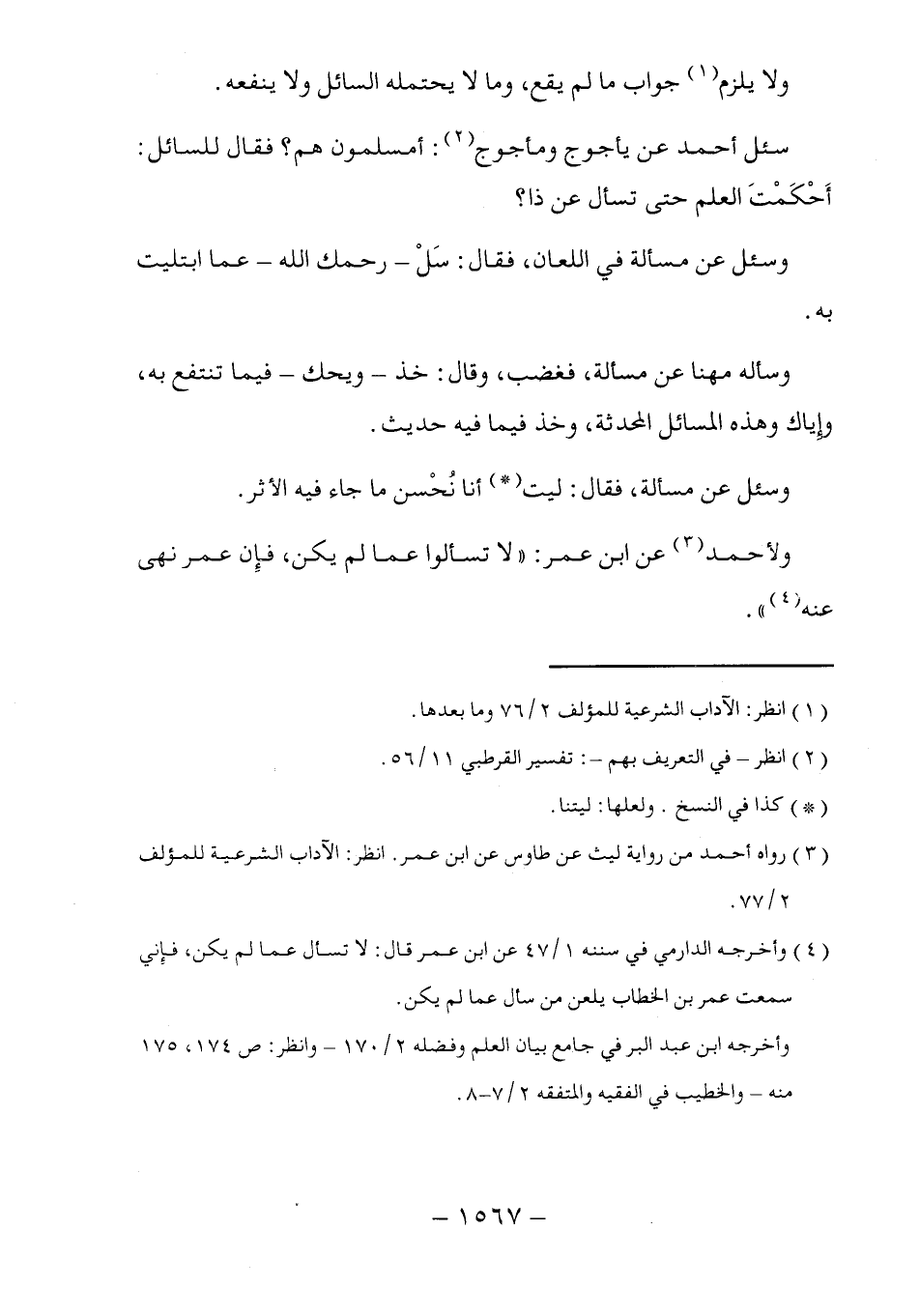 (٤) وأخرجه الدارمي في سننه ١/ ٤٧ عن ابن عمر قال: لا تسأل عما لم يكن، فإني سمعت عمر بن الخطاب يلعن من سأل عما لم يكن.