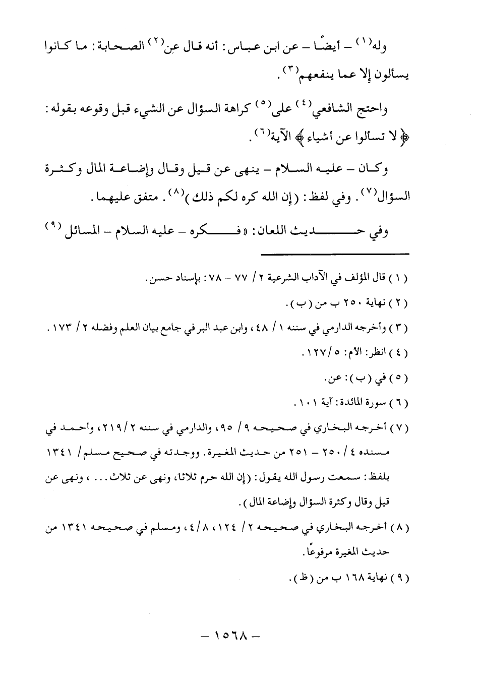 (٧) أخرجه البخاري في صحيحه ٩/ ٩٥، والدارمي في سننه ٢/ ٢١٩، وأحمد في مسنده ٤/ ٢٥٠ - ٢٥١ من حديث المغيرة. ووجدته في صحيح مسلم/ ١٣٤١ بلفظ: سمعت رسول الله يقول: (إِن الله حرم ثلاثاً، ونهى عن ثلاث ... ، ونهى عن قيل وقال وكثرة السؤال وإضاعة المال).