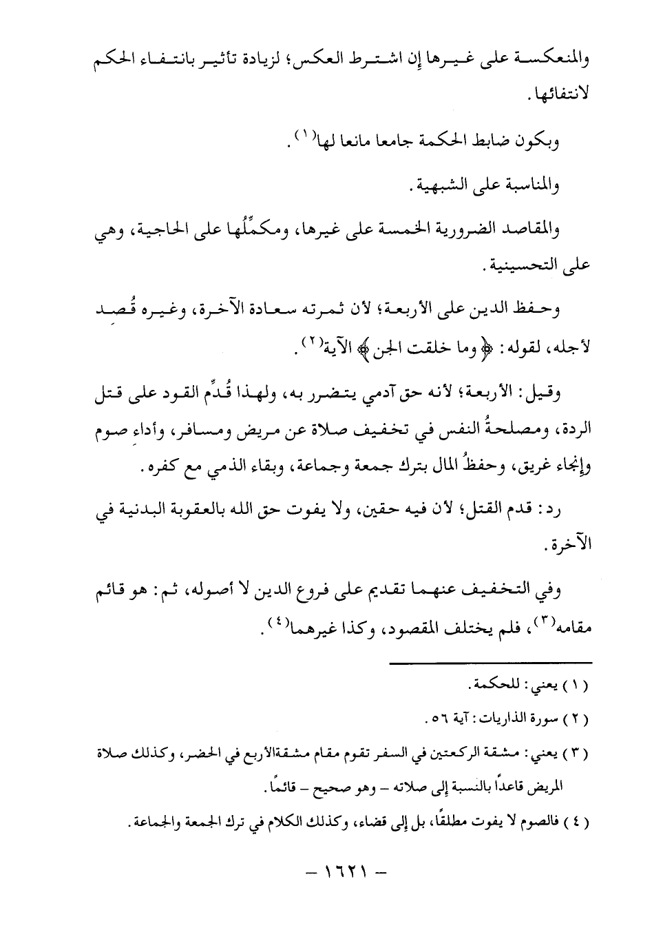 وحفظ الدين على الأربعة؛ لأن ثمرته سعادة الآخرة، وغيره قُصِد لأجله؛ لقوله: (وما خلقت الجن) الآية (٢).