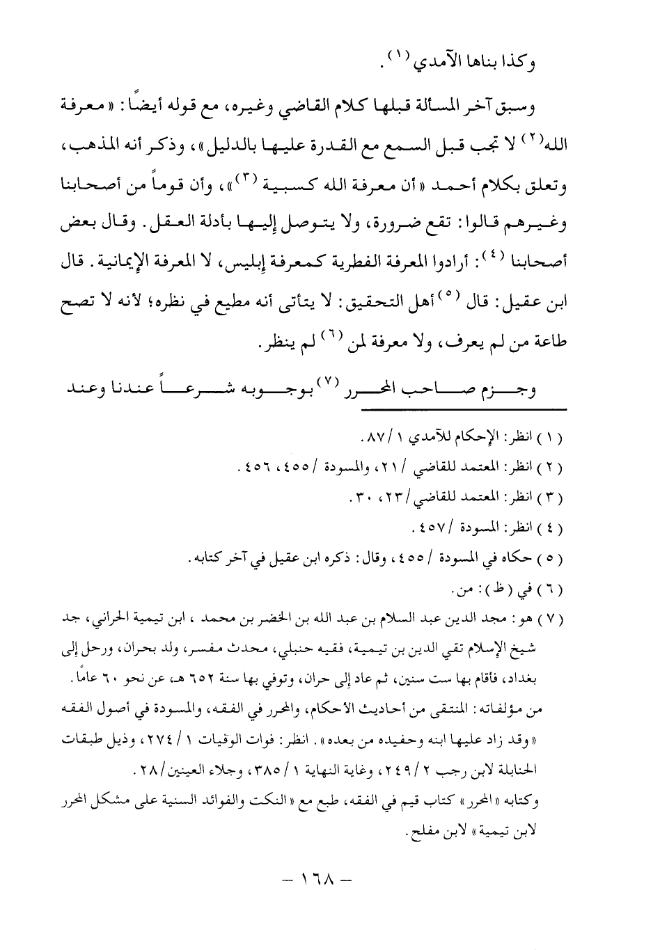 (٧) هو: مجد الدين عبد السلام بن عبد الله بن الخضر بن محمد، ابن تيمية الحراني، جد شيخ الإِسلام تقي الدين بن تيمية، فقيه حنبلي، محدث مفسر، ولد بحران، ورحل إلى بغداد، فأقام بها ست سنين، ثم عاد إِلى حران، وتوفي بها سنة ٦٥٢ هـ، عن نحو ٦٠ عامًا. من مؤلفاته: المنتقى من أحاديث الأحكام، والمحرر في الفقه، والمسودة في أصول الفقه "وقد زاد عليها ابنه وحفيده من بعده". انظر: فوات الوفيات ١/ ٢٧٤، وذيل طبقات الحنابلة لابن رجب ٢/ ٢٤٩، وغاية النهاية ١/ ٣٨٥، وجلاء العينين/ ٢٨.