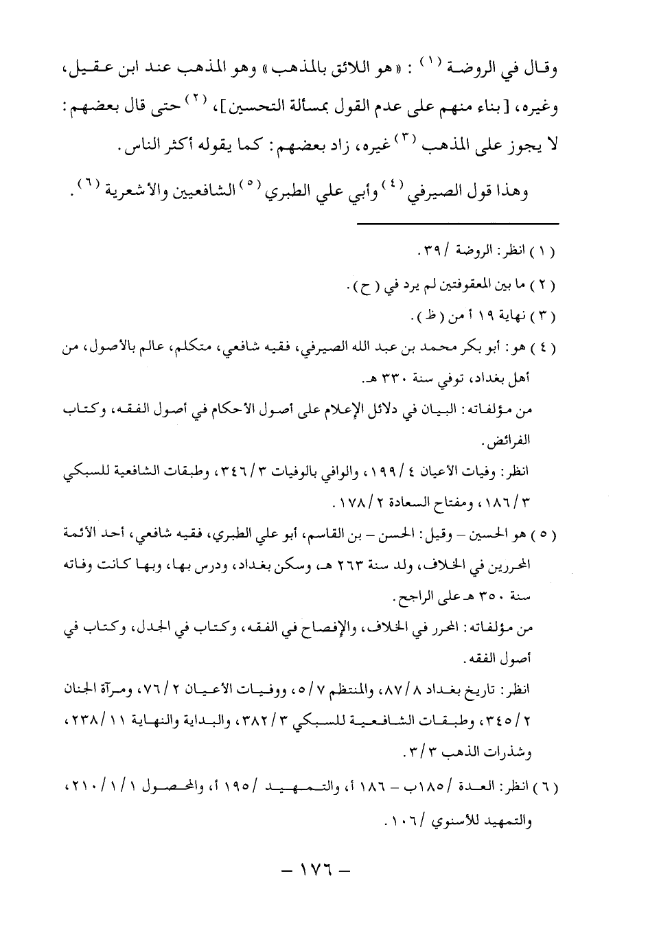(٥) هو الحسين -وقيل: الحسن- بن القاسم، أبو علي الطبري، فقيه شافعي، أحد الأئمة المحررين في الخلاف، ولد سنة ٢٦٣ هـ، وسكن بغداد، ودرس بها، وبها كانت وفاته سنة ٣٥٠ هـ على الراجح.