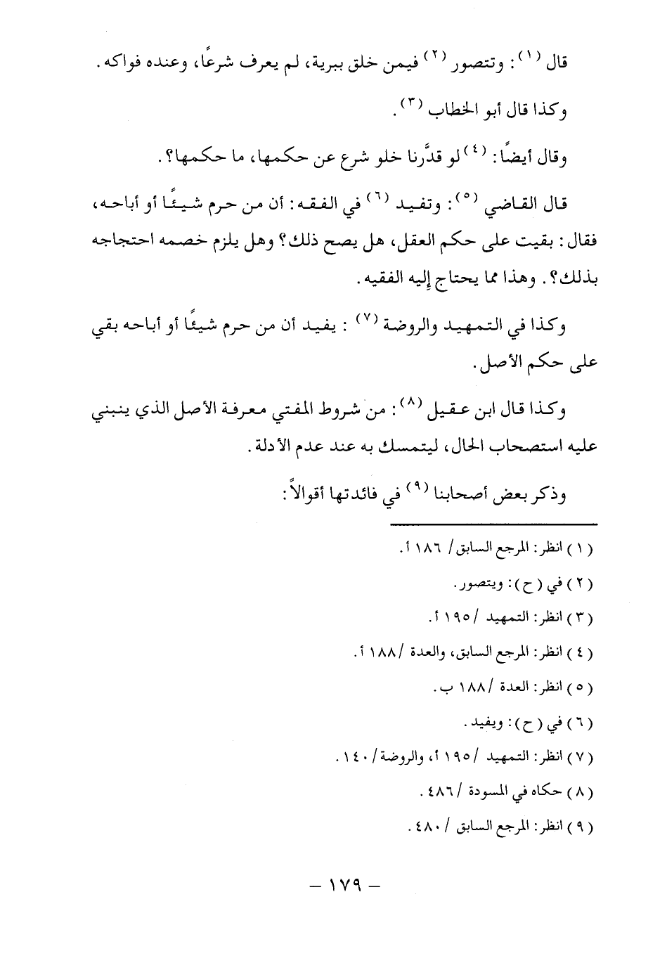 وكذا قال ابن عقيل (٨): من شروط المفتي معرفة الأصل الذي ينبني عليه استصحاب الحال، ليتمسك به عند عدم الأدلة.