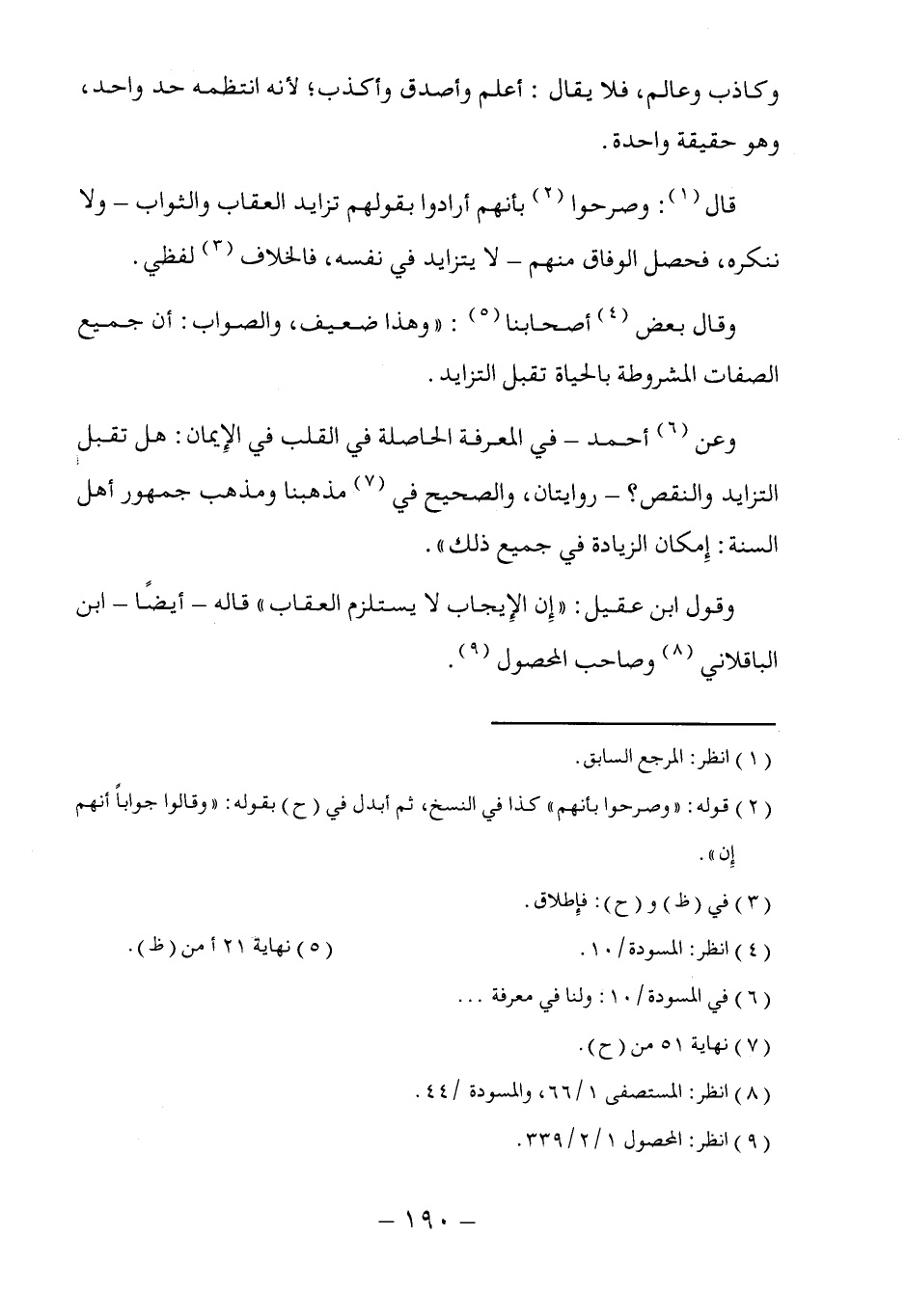 وعن (٦) أحمد -في المعرفة الحاصلة في القلب في الإِيمان: هل تقبل التزايد والنقص؟ - روايتان، والصحيح في (٧) مذهبنا ومذهب جمهور أهل السنة: إِمكان الزيادة في جميع ذلك".