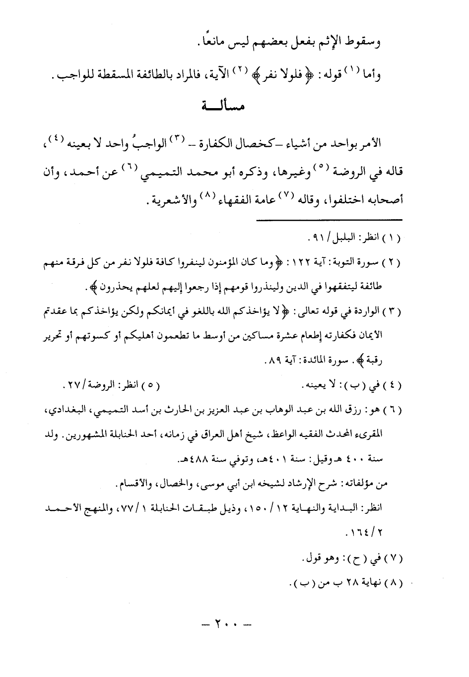 (٢) سورة التوبة: آية ١٢٢: (وما كان المؤمنون لينفروا كافة فلولا نفر من كل فرقة منهم طائفة ليتفقهوا في الدين ولينذروا قومهم إِذا رجعوا إِليهم لعلهم يحذرون).