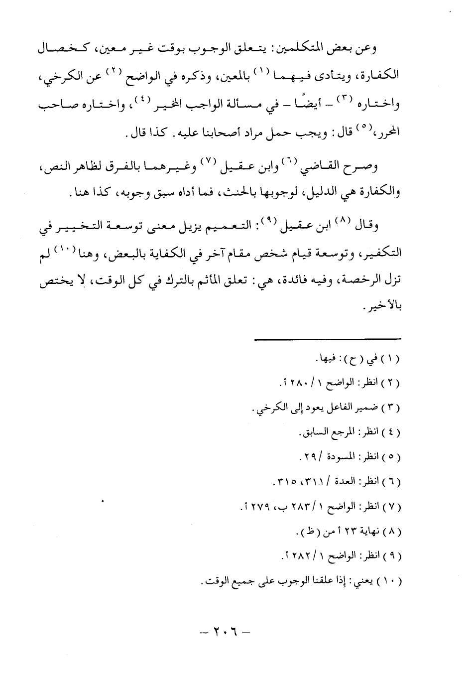 وعن بعض المتكلمين: يتعلق الوجوب بوقت غير معين، كخصال الكفارة، ويتأدى فيهما (١) بالمعين، وذكره في الواضح (٢) عن الكرخي، واختاره (٣) -أيضًا- في مسألة الواجب الخير (٤)، واختاره صاحب المحرر، (٥) قال: ويجب حمل مراد أصحابنا عليه. كذا قال.