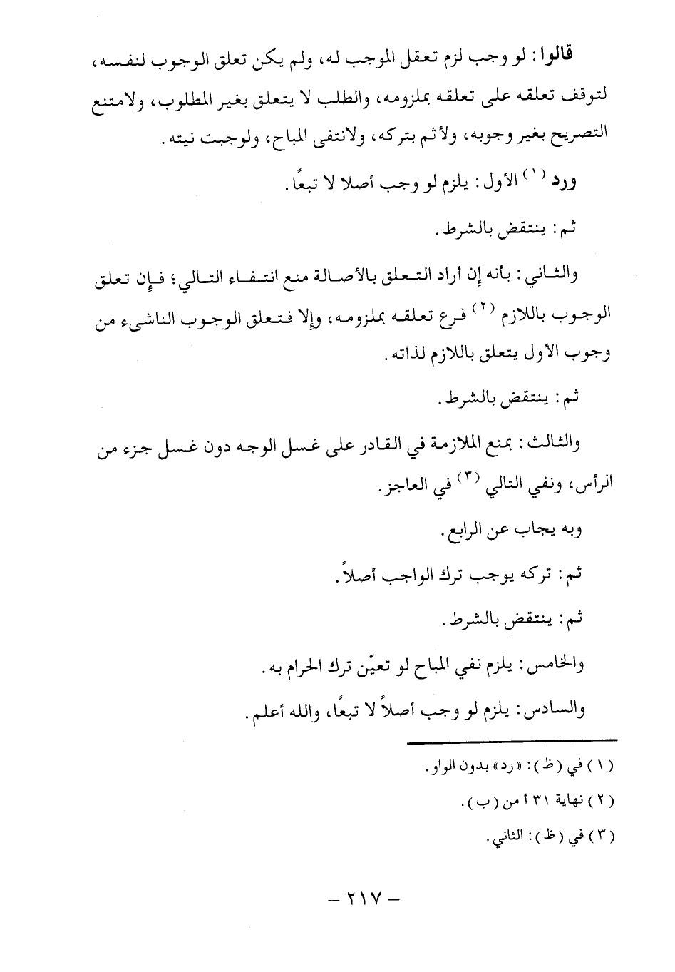 والثاني: بأنه إِن أراد التعلق بالأصالة منع انتفاء التالي؛ فإِن تعلق الوجوب باللازم (٢) قرع تعلقه بملزومه، وإِلا فتعلق الوجوب الناشئ من وجوب الأول يتعلق باللازم لذاته.
