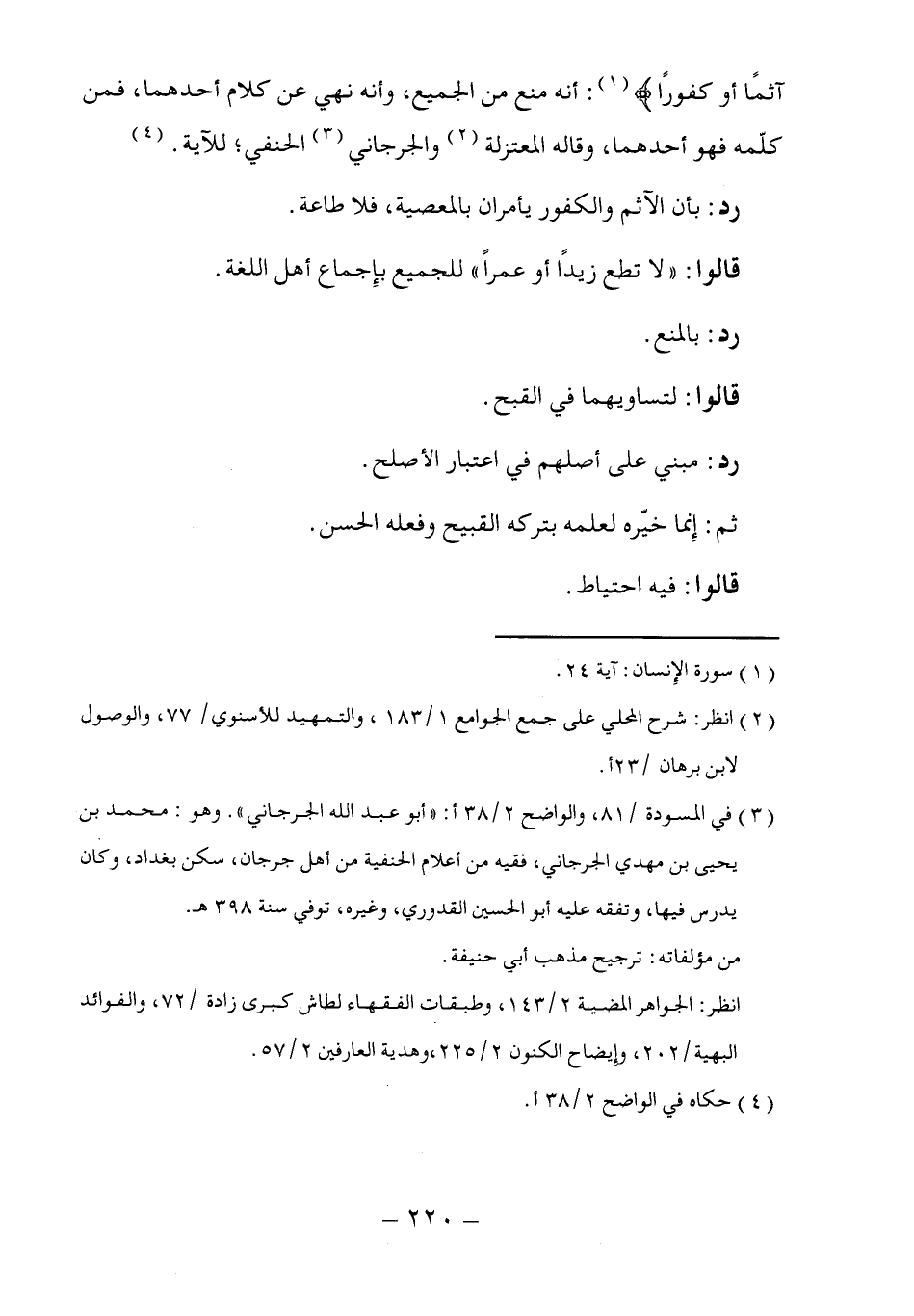 آثمًا أو كفورًا) (١): أنه منع من الجميع، وأنه نهي عن كلام أحدهما، فمن كلّمه فهو أحدهما، وقاله المعتزلة (٢) والجرجاني (٣) الحنفي؛ للآية. (٤)