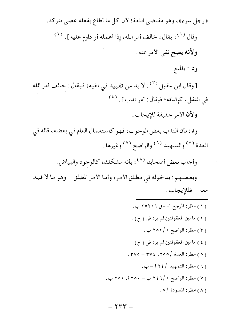 [وقال ابن عقيل (٣): لا بد من تقييد في نفيه، فيقال: خالف أمر الله في النفل، كإِثباته، فيقال: أمر ندب]. (٤)