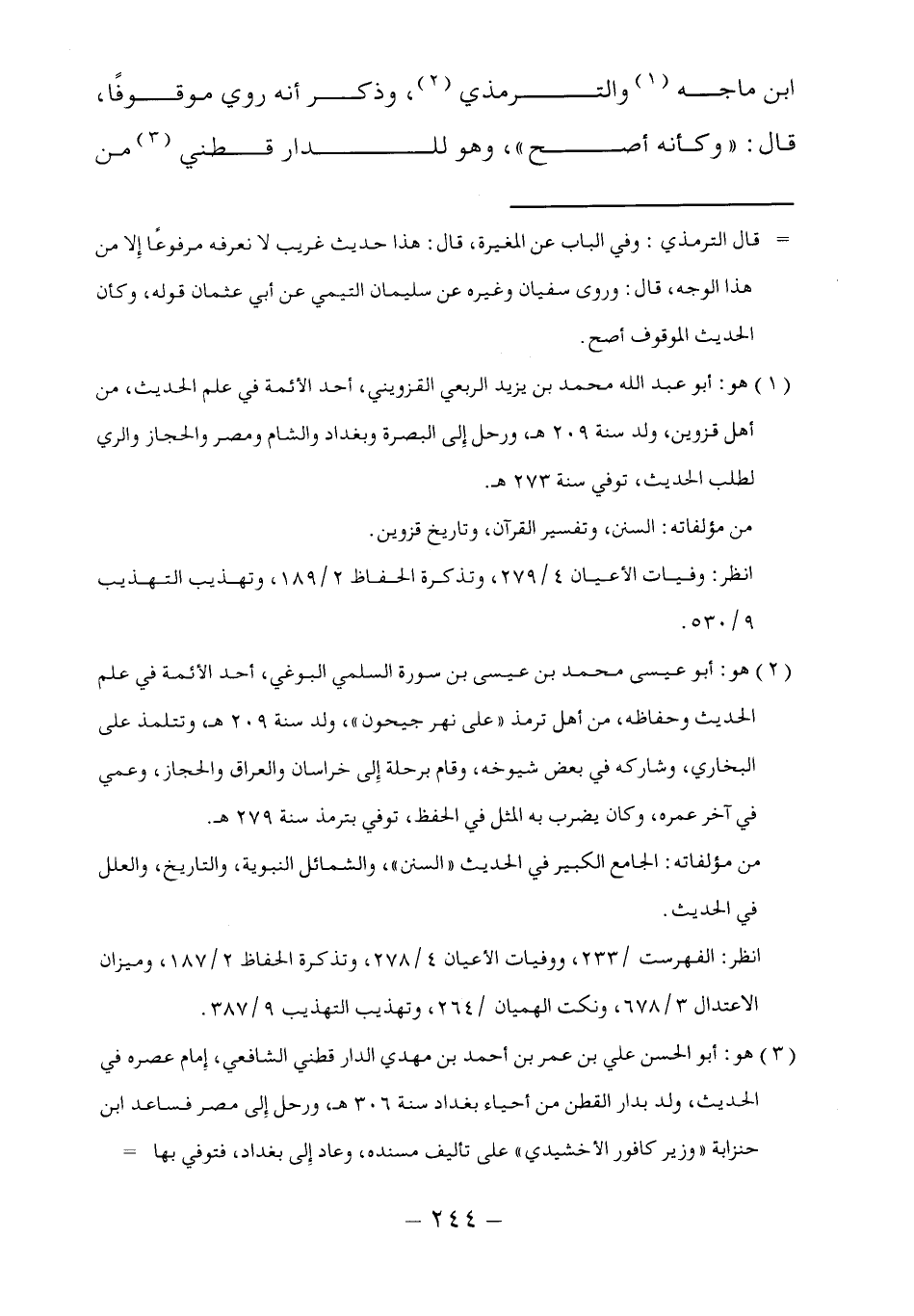 (١) هو: أبو عبد الله محمد بن يزيد الربعي القزويني، أحد الأئمة في علم الحديث، من أهل قزوين، ولد سنة ٢٠٩ هـ، ورحل إِلى البصرة وبغداد والشام ومصر والحجاز والري لطلب الحديث، توفي سنة ٢٧٣ هـ.