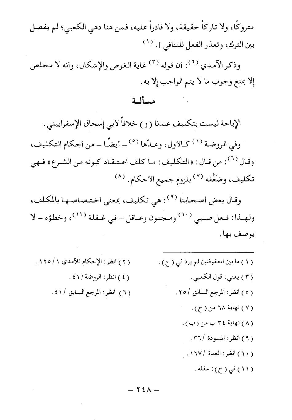 الإِباحة ليست بتكليف عندنا (و) خلافاً لأبي إِسحاق الإِسفراييني.