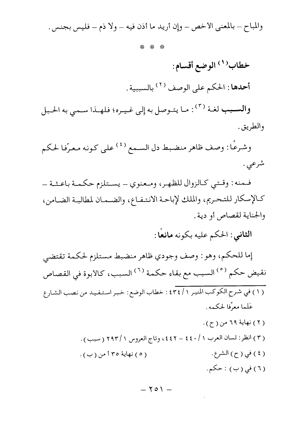 إِما للحكم، وهو: وصف وجودي ظاهر منضبط مستلزم لحكمة تقتضي نقيض حكم (٥) السبب مع بقاء حكمة (٦) السبب، كالأبوة في القصاص