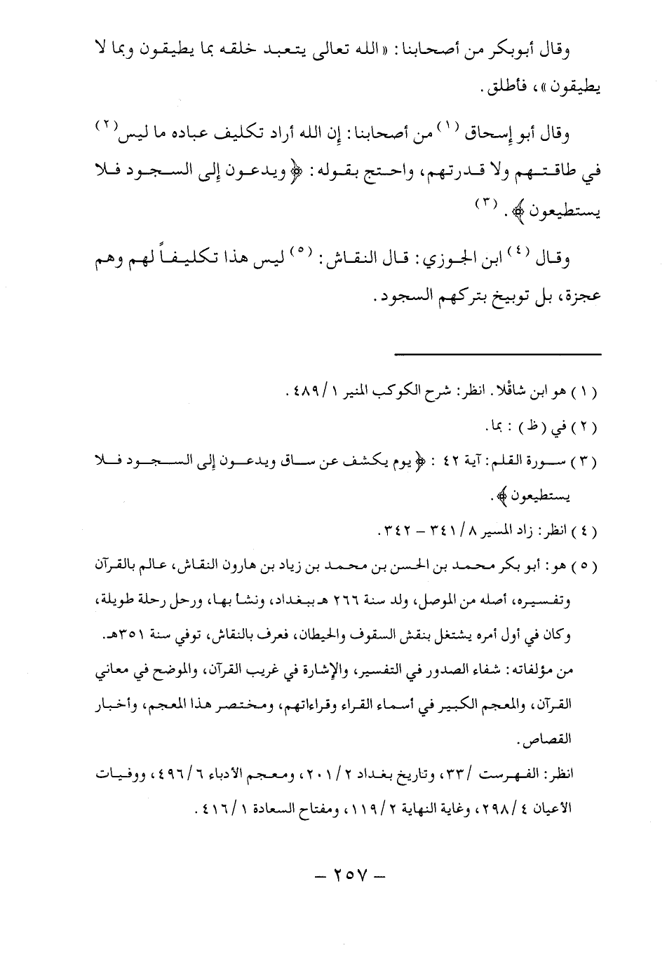(٣) سورة القلم: آية ٤٢: (يوم يكشف عن ساق ويدعون إِلى السجود فلا يستطيعون).