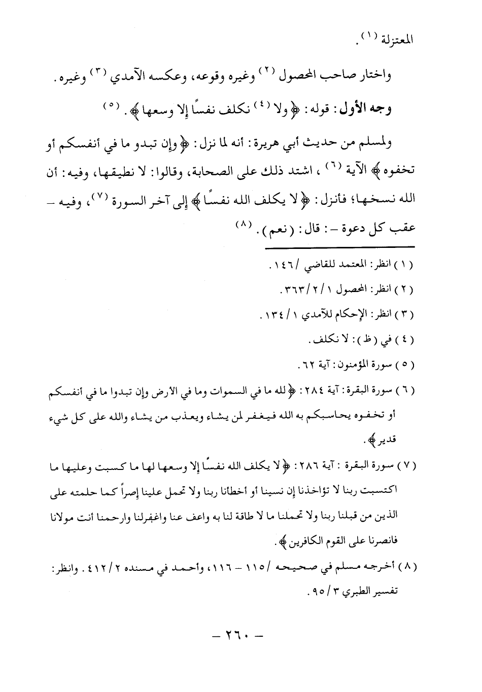 (٧) سورة البقرة: آية ٢٨٦: (لا يكلف الله نفسًا إِلا وسعها لها ما كسبت وعليها ما اكتسبت ربنا لا تؤاخذنا إِن نسينا أو أخطأنا ربنا ولا تحمل علينا إِصراً كما حلمته على الذين من قبلنا ربنا ولا تحملنا ما لا طاقة لنا به واعف عنا واغفر لنا وارحمنا أنت مولانا فانصرنا على القوم الكافرين).
