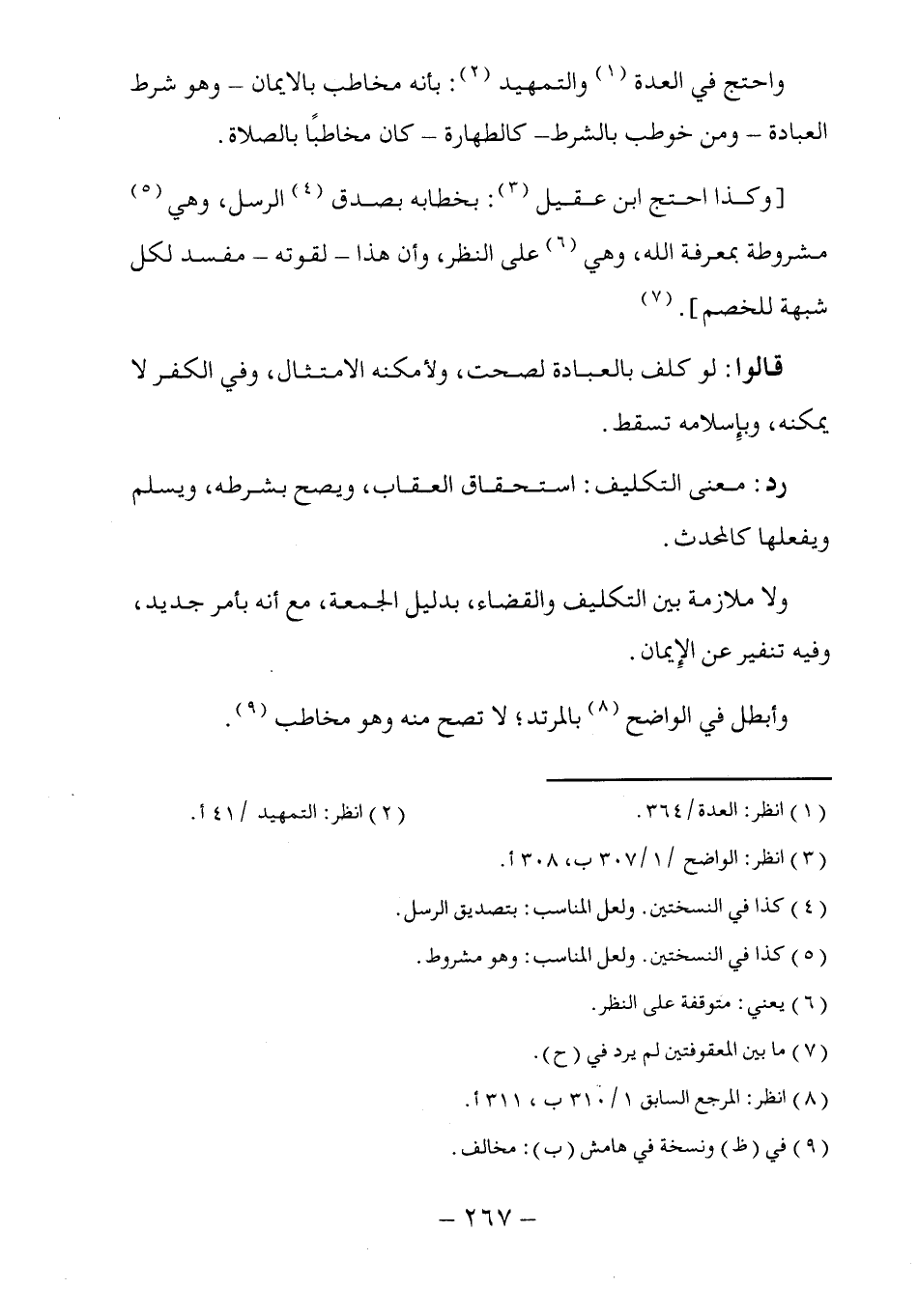واحتج في العدة (١) والتمهيد (٢): بأنه مخاطب بالإيمان -وهو شرط العبادة- ومن خوطب بالشرط -كالطهارة- كان مخاطبًا بالصلاة.