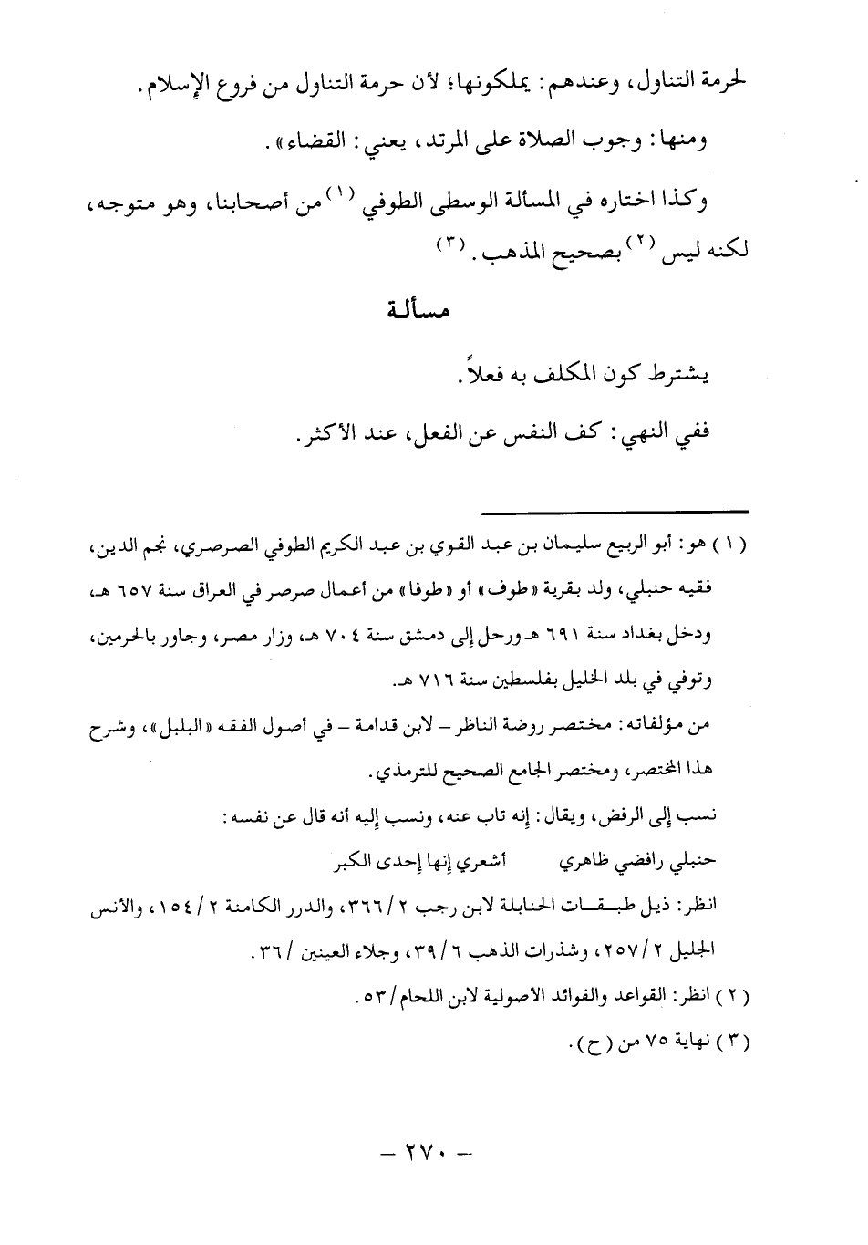(١) هو: أبو الربيع سليمان بن عبد القوي بن عبد الكريم الطوفي الصرصري، نجم الدين، فقيه حنبلي، ولد بقرية "طوف" أو "طوفا" من أعمال صرصر في العراق سنة ٦٥٧ هـ، ودخل بغداد سنة ٦٩١ هـ ورحل إِلى دمشق سنة ٧٠٤ هـ، وزار مصر، وجاور بالحرمين، وتوفي في بلد الخليل بفلسطين سنة ٧١٦ هـ.