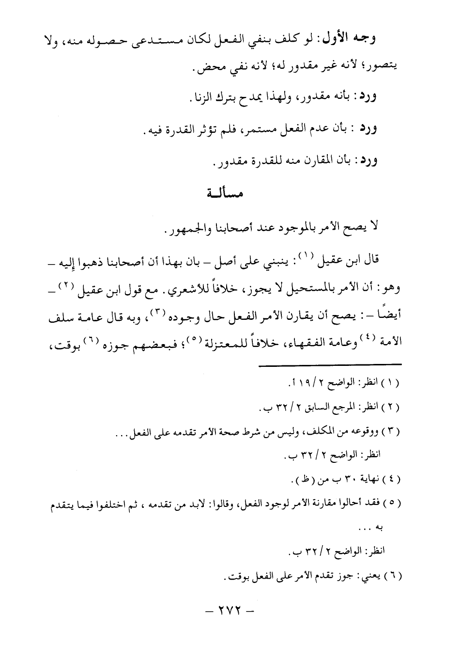 (٥) فقد أحالوا مقارنة الأمر لوجود الفعل، وقالوا: لابد من تقدمه، ثم اختلفوا فيما يتقدم به ....