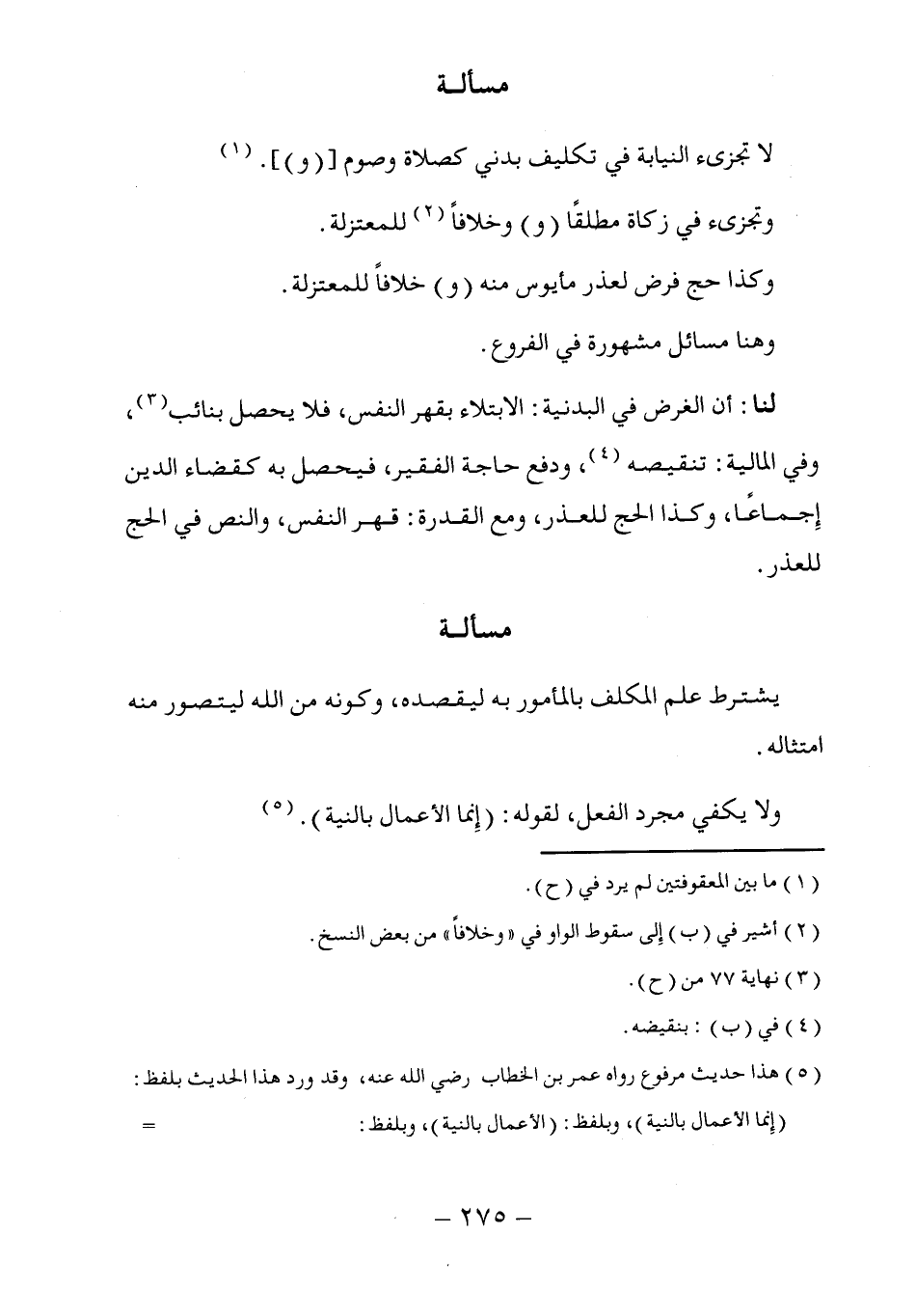 (٥) هذا حديث مرفوع رواه عمر بن الخطاب رضي الله عنه، وقد ورد هذا الحديث بلفظ: (إِنما الأعمال بالنية)، وبلفظ: (الأعمال بالنية)، وبلفظ:=