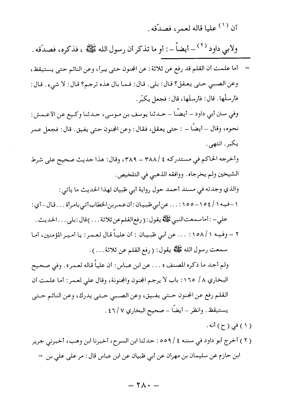 ٢ - وفيه ١/ ١٥٨: ... عن أبي ظبيان: أن علياً قال لعمر: يا أمير المؤمنين، أما سمعت رسول الله - صلى الله عليه وسلم - يقول: (رفع القلم عن ثلاثة ...).