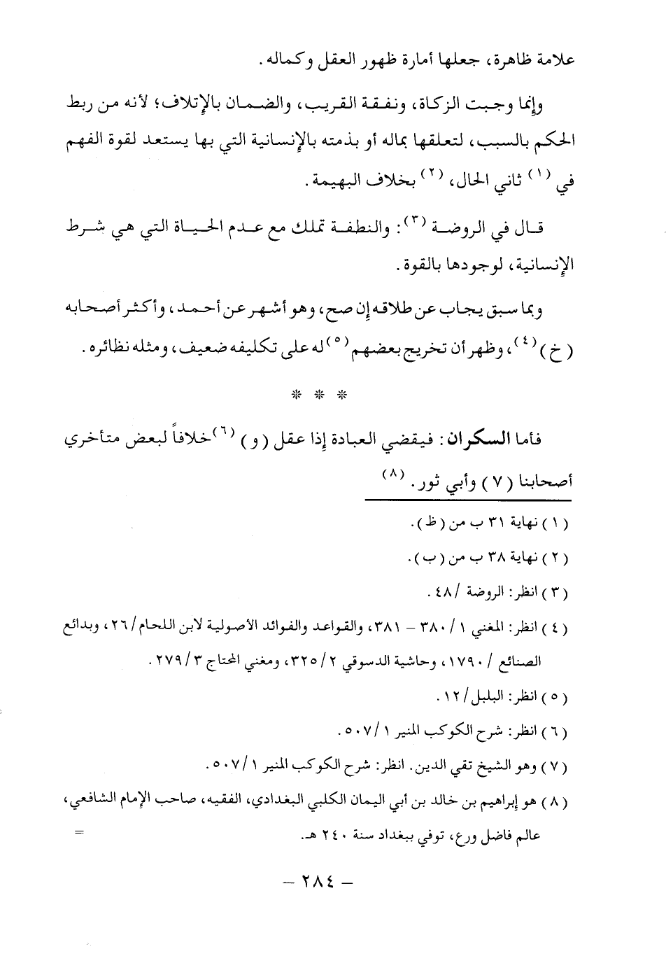 فأما السكران: فيقضي العبادة إِذا عقل (و) (٦) خلافاً لبعض متأخري أصحابنا (٧) وأبي ثور. (٨)