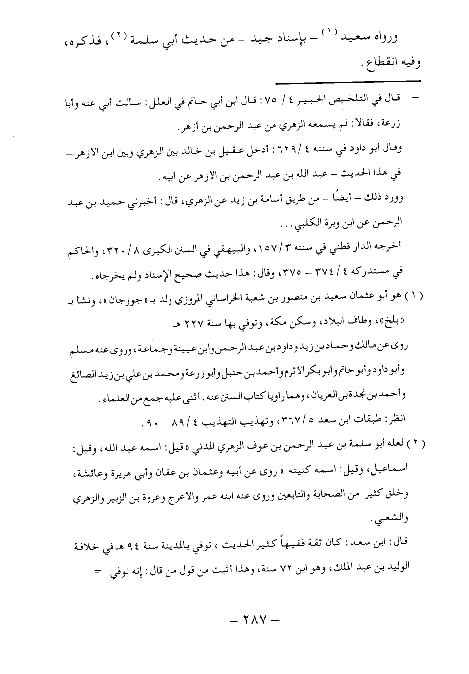 =قال في التلخيص الحبير ٤/ ٧٥: قال ابن أبي حاتم في العلل: سألت أبي عنه وأبا زرعة، فقالا: لم يسمعه الزهري من عبد الرحمن بن أزهر.