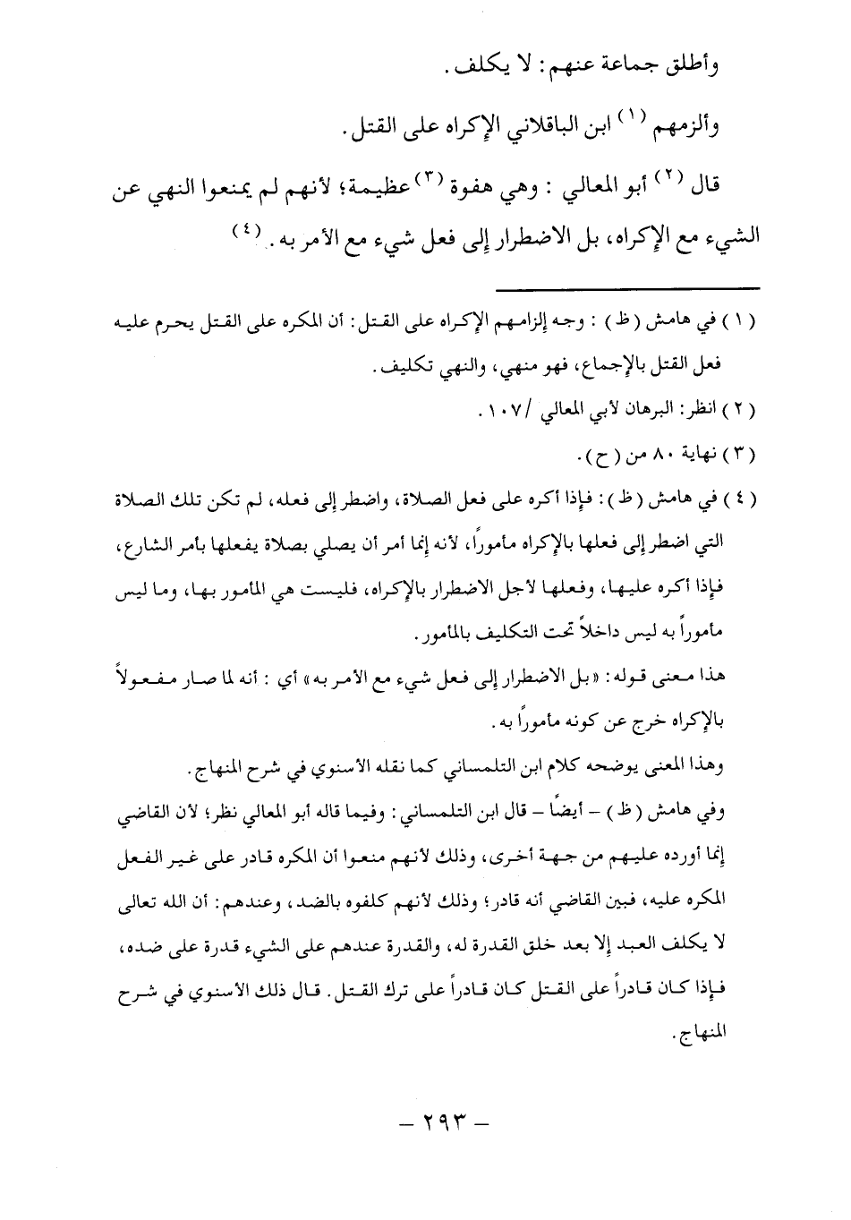 (٤) في هامش (ظ): فإِذا أكره على فعل الصلاة، واضطر إلى فعله، لم تكن تلك الصلاة التي اضطر إِلى فعلها بالإِكراه مأمورًا، لأنه إِنما أمر أن يصلي بصلاة يفعلها بأمر الشارع، فإِذا أكره عليها، وفعلها لأجل الاضطرار بالإِكراه، فليست هي المأمور بها، وما ليس مأموراً به ليس داخلاً تحت التكليف بالمأمور.