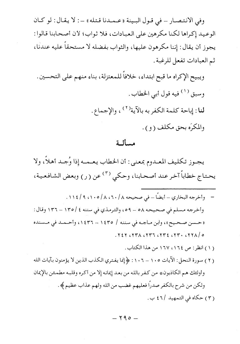 (٢) سورة النحل: الآيات ١٠٥ - ١٠٦: (إِنما يفتري الكذب الذين لا يؤمنون بآيات الله وأولئك هم الكاذبون * من كفر بالله من بعد إِيمانه إِلا من أكره وقلبه مطمئن بالإِيمان ولكن من شرح بالكفر صدرًا فعليهم غضب من الله ولهم عذاب عظيم).