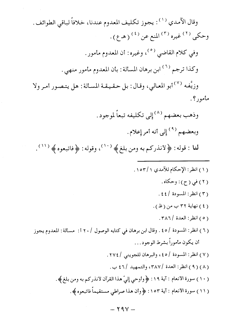 وذهب بعضهم (٨) إِلى تكليفه تبعاً لموجود.