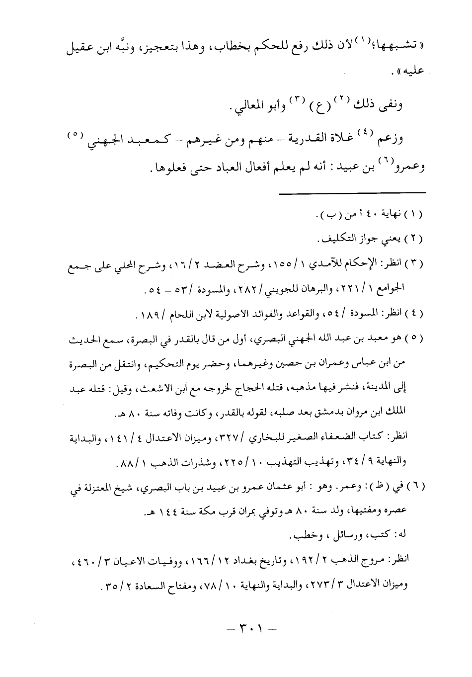 (٦) في (ظ): وعمر. وهو: أبو عثمان عمرو بن عبيد بن باب البصري، شيخ المعتزلة في عصره ومفتيها، ولد سنة ٨٠ هـ وتوفي بمران قرب مكة سنة ١٤٤ هـ.