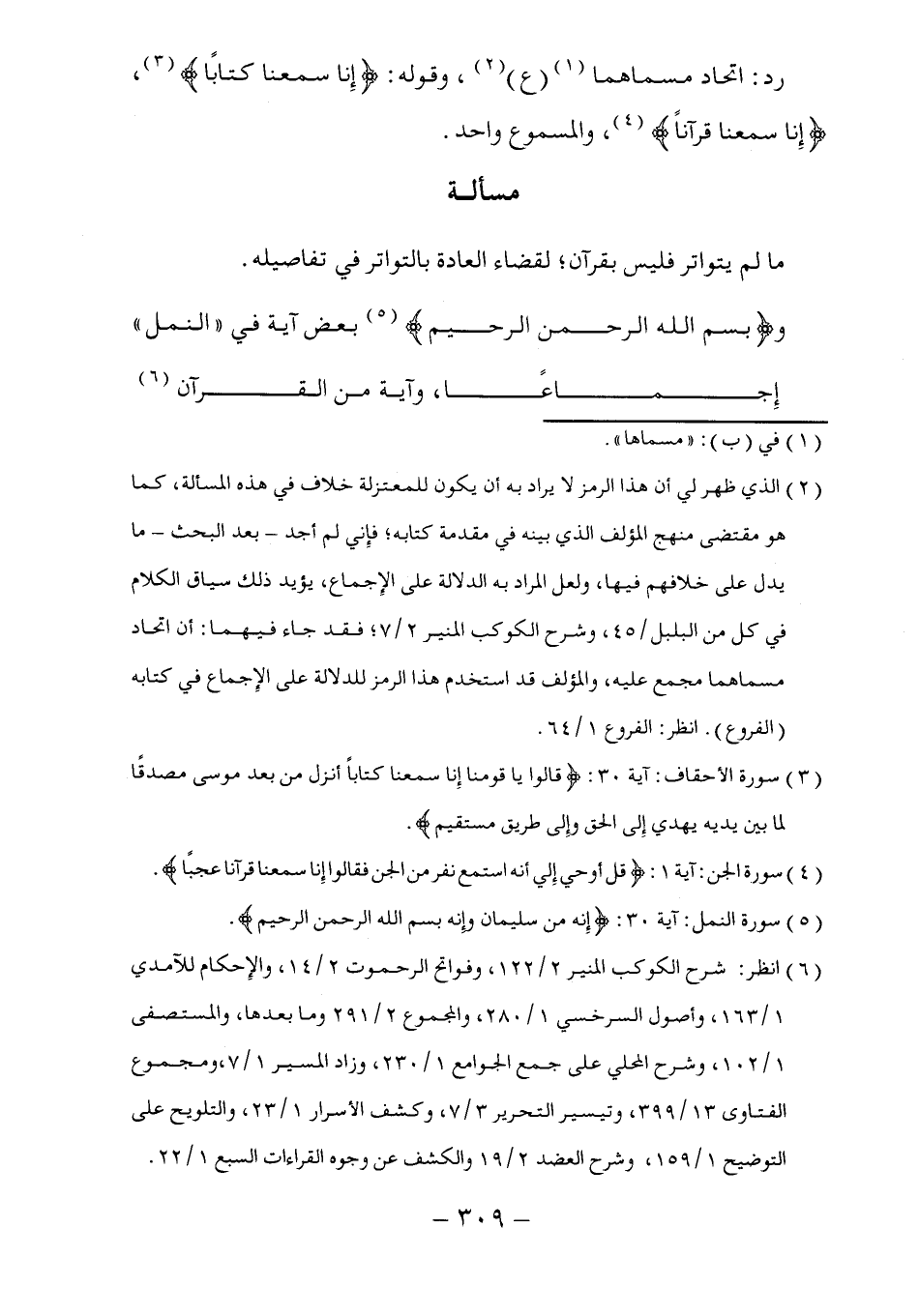رد: اتحاد مسماهما (١) (ع) (٢)، وقوله: (إِنا سمعنا كتابًا) (٣)، (إِنا سمعنا قرآناً) (٤)، والمسموع واحد.