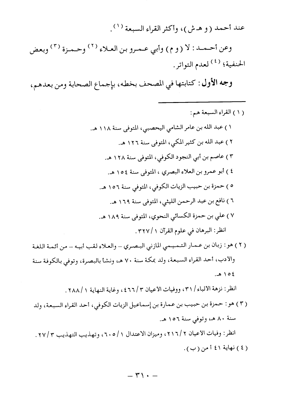 (٣) هو: حمزة بن حبيب بن عمارة بن إِسماعيل الزيات الكوفي، أحد القراء السبعة، ولد سنة ٨٠ هـ، وتوفي سنة ١٥٦ هـ.