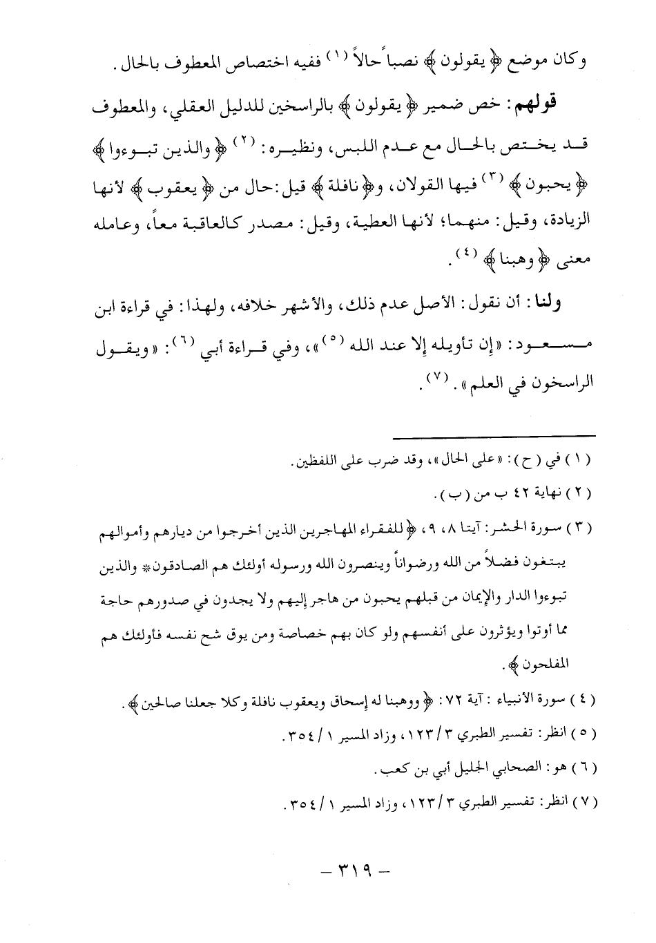 قولهم: خص ضمير (يقولون) بالراسخين للدليل العقلي، والمعطوف قد يختص بالحال مع عدم اللبس، ونظيره: (٢) (والذين تبوءوا) (يحبون) (٣) فيها القولان، و (نافلة) قيل: حال من (يعقوب) لأنها الزيادة، وقيل: منهما؛ لأنها العطية، وقيل: مصدر كالعاقبة معاً، وعامله معنى (وهبنا) (٤).