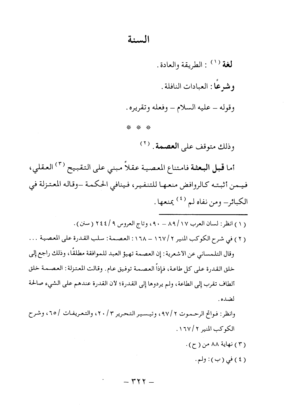 (٢) في شرح الكوكب المنير ٢/ ١٦٧ - ١٦٨: العصمة: سلب القدرة على المعصية ... وقال التلمساني عن الأشعرية: إِن العصمة تهيؤ العبد للموافقة مطلقًا، وذلك راجع إِلى خلق القدرة على كل طاعة، فإِذاً العصمة توفيق عام. وقالت المعتزلة: العصمة خلق ألطاف تقرب إِلى الطاعة، ولم يردوها إِلى القدرة، لأن القدرة عندهم على الشيء صالحة لضده.
