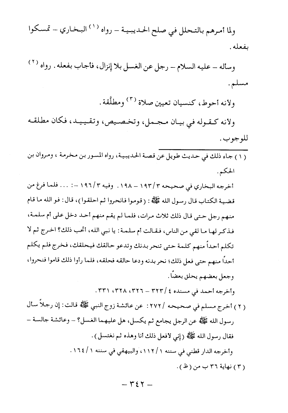 ولما أمرهم بالتحلل في صلح الحديبية -رواه (١) البخاري- تمسكوا بفعله.